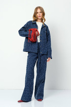 Жакет современного прямого силуэта однобортный, застёгивающийся на петли и пуговицы, край борта скругленный по низу изделия. Воротник пиджачного типа с отложными лацканами. По переду обработаны прорезные карманы в рамку с клапанами. Рукава втачные двухшовные. Спинка со средним швом. Изделие на подкладке.