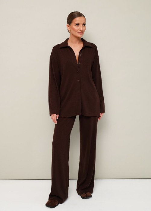 Комфортный брючный комплект с джемпером, выполнен из качественного трикотажного полотна. Джемпер прямого силуэта. Горловина с отложным воротником. Центральная застёжка на петли и пуговицы. Длинные рукава со спущенной линией втачивания плеча. Брюки прямого кроя с посадкой на талии. Пояс обработан эластичной резинкой.
