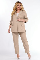 Жакет современного прямого силуэта, двубортный с застежкой на петли и пуговицы. По плечевому шву обработаны погоны. Воротник пиджачного типа с отложными лацканами. Спереди отлетная кокетка. Рукава кроя реглан, с патами по низу, с фиксацией на пряжки. Спинка со средним швом. Изделие на подкладке. В комплекте пояс из основной ткани с пряжкой.