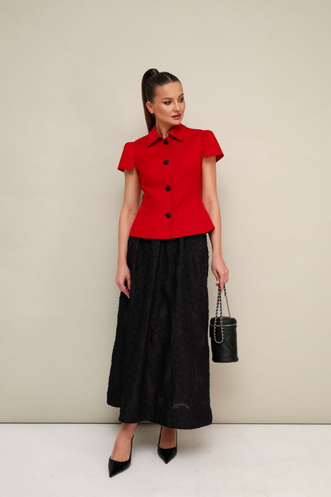Жакет полуприлегающего силуэта, с центральной застежкой на петли и пуговицы. Воротник отложной со стойкой. Рукава короткие с вытачками по окату и разрезами по низу. Жакет на подкладке.