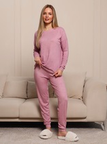 Костюм женский из гладкокрашеного трикотажного полотна "кулирка с лайкрой" состоящий из футболки и брюк. Футболка – классического покроя, с короткими втачными рукавами и горловиной овальной формы, обработанной втачной планкой, на полочке выполнен принт в технике "шелкографии".Брюки – длинные, классического кроя, на притачном поясе с эластичной тесьмой внутри и карманами в боковых швах. Передние половины брюк застрочены по центральным линиям. По центру пояса настрочен декоративный элемент.