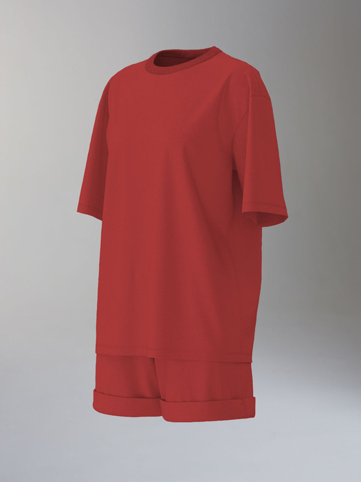 Женский спортивный костюм летний из хлопкового трикотажного полотна. Верх костюма - футболка свободного силуэта оверсайз с заниженой линией плеча, с коротким рукавом. Нижняя часть комплекта - шорты средней длины, с карманами в боковых подрезах, низ шорт - с отворотами. Пояс шорт на эластичной резинке.