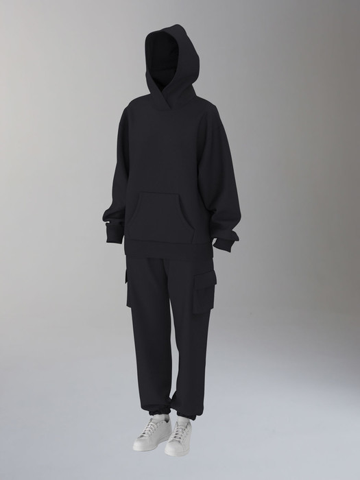 Женский спортивный костюм из плотного трикотажа с петельной изнанкой. Верх комплекта - толстовка-худи Оверсайз с капюшоном, с накладным карманом "кенгуру". Рукава толстовки втачные, свободные с заниженной линией плеча и с эластичными манжетами. Брюки свободные, на высоком поясе,книзу заужены на резинку. Брюки имеют две пары карманов: верхние карманы брюк наклонные, прорезные, с бочком, ниже - накладные объемные каманы с клапанами. Пояс брюк по линии талии дополнительно регулируется шнуром.