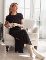 Комплект женский, состоящий из блузки и юбки. Блузка свободного кроя, длиной до бедер. Спинка со средним швом, в котором по горловине обработана застежка на навесную петлю и пуговицу. По переду нагрудные вытачки. Блузка без рукавов, с фигурной проймой. Горловина округлой формы. Юбка прямого силуэта, длиной чуть ниже щиколотки. Заднее полотнище с талиевыми вытачками и средним швом. Переднее полотнище со средним швом, в котором обработан высокий разрез, с боковыми карманами с наклонным входом с клапанами. На клапанах пришиты пуговицы. В среднем шве переда обработана застежка на тесьму-«молнию» с гульфиком и откоском. юбка на притачном поясе с фигурным уступом по переду, с резинкой по спинке. По поясу вставлены шлевки. Пояс с застежкой на петлю и пуговицу. По поясу застежка на петлю и пуговицу.