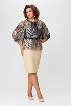Комплект женский, состоящий из блузки и юбки. Блузка свободного кроя, длиной ниже линии бедер. Спинка со средним швом, в котором по горловине обработана застежка на навесную петлю и пуговицу. По переду нагрудные вытачки. Блузка без рукавов. Горловина округлой формы. блузку дополняет съемный пояс. Юбка А-образного силуэта, длиной чуть ниже щиколотки. Верхний срез юбки обработан резинкой.