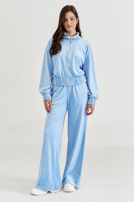 Комплект, состоящий из бомбера и брюк. Бомбер, свободного кроя, длиной чуть ниже талии. По переду застежка на декоративную тесьму-«молнию».  По горловине воротник стойка. Линия плеча спущена. Рукава длинные, по низу с притачной манжетой, в которую вставлена резинка. По  низу бомбера вставлена резинка. Брюки свободного кроя, длинные, на притачном поясе с резинкой. В боковых обработаны карманы с наклонным входом.