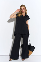 Костюм женский предназначен для повседневной носки. Костюм женский 2-х предметный блузка и юбка-брюки. Блузка женская прямого силуэта, длиной до линии бёдер. Перед с 2-мя нагрудными вытачками. Спинка с отрезной кокеткой, с 1-ной встречной складкой, кокетка декорирована пришивной металлической пластиной. Боковые швы с разрезами. Горловина круглая, обточная, без воротника. Рукав втачной одно шовный, короткий, с приточной отложной манжетой. Блузка без плечевых накладок. Юбка-брюки длинные широкие. Передние половинки с карманами в боковых швах с 2-мя односторонними зафиксированными складками на каждой половинке. Задние без конструктивных особенностей. Пояс притачной, собран на эластичную тесьму, закреплённую 2-мя отделочными строчками. Длина брюк по боковому срезу 90 см. Длина спинки блузона 56 см, длина рукава 22 см.