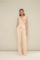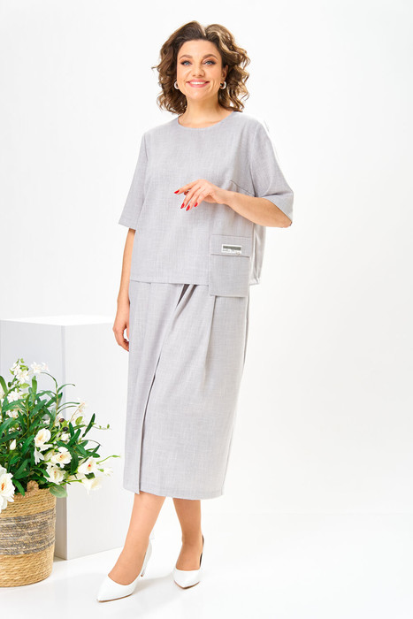 Костюм женский, предназначен для повседневной носки. Костюм женский 2-х предметный, блузон и юбка-брюки. Блузон женский прямого силуэта, длиной выше линии бёдер на 4 см. Перед с 2-мя нагрудными вытачками, с накладным отлётным прямоугольным карманом с клапаном, декорированным надстрочной аппликацией на левой части переда. Спинка цельнокроеная. Горловина круглая, обточная, без воротника. Рукав втачной одно шовный, длиной до локтя. Блузон без плечевых накладок. Юбка-брюки свободного покроя, длиной до нижней части икры. Передние половинки с отлётной отделочной деталью справа имитирующей запах. Передние половинки с карманами в боковых швах с отрезными бочками с 2-мя односторонними складками на линии талии. Юбка брюки с притачным поясом, частично собранным на эластичную тесьму, закреплённую 2-мя отделочными строчками. Длина юбки-брюк 83 см. Длина спинки блузона 53 см, длина рукава 31,5 см.