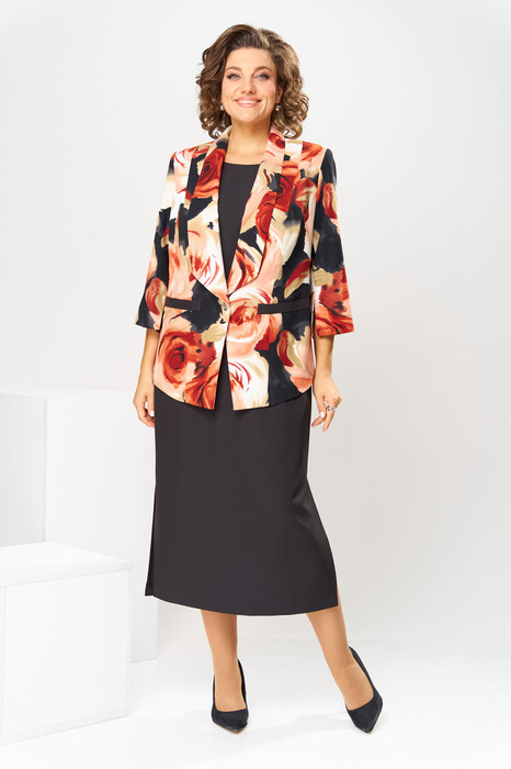 Комплект женский относится к торжественной нарядной одежде. Комплект женский 2-х предметный жакет и платье. Жакет полуприлегающего силуэта с фигурным низом, длиной до линии бёдер. Перед с 2-мя отрезными рельефами и 2-мя настрочными листочками на уровне линии талии. Спинка со средним швом. Горловина с V-образным вырезом с цельнокроеным воротником. Застёжка центральная бортовая на 1-ну петлю и 1-ну пришивную пуговицу. Рукав втачной, 2-х шовный, длиной 3/4, с разрезом внизу локтевого шва. Жакет на приточной подкладке. Жакет с плечевыми накладками. Платье женское полуприлегающего силуэта, длиной до середины икры. Платье отрезное по линии талии. Верхняя часть переда с 2-мя отрезными бочками; нижняя часть переда с 2-мя таллиевыми выточками. Шов соединения частей переда по линии талии декорирован термо тесьмой. Спинка верхняя часть с 2-мя таллиевыми вытачками; нижняя часть спинки с 2-мя таллиевыми вытачками. Боковые швы с разрезами. Горловина круглая обточная без воротника. Застёжка на потайную тесьму-молнию в левом боковом шве платья. Рукав втачной, короткий одношовный. Платье без плечевых накладок. Длина спинки жакета 64 см, длина рукава 45 см. Длина спинки платья 120 см, длина рукава 21 см