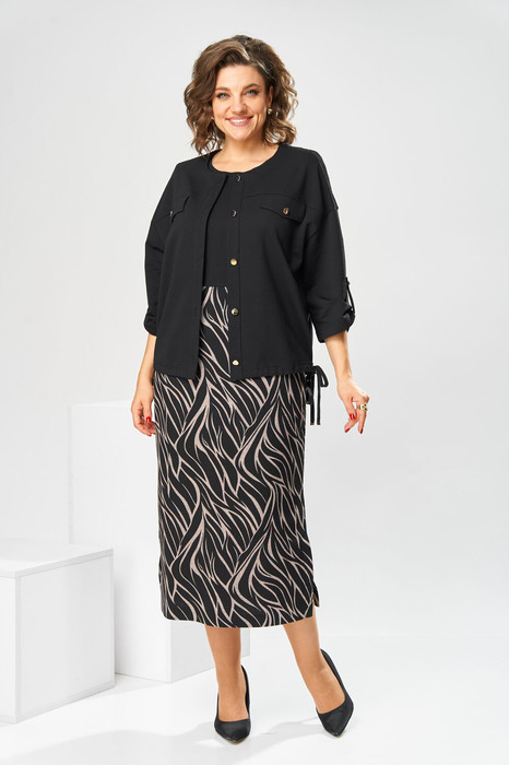 Комплект женский предназначен для повседневной носки. Комплект женский 2-х предметный жакет и платье. Жакет женский прямого силуэта, длиной до линии бёдер. Перед с 2-мя отрезными кокетками, верхняя декорирована отделочной тканью, шов соединения нижней кокетки с передом с фигурным клапаном с фиксацией к переду на петлю-пуговицу; перед с 2-мя притачными вертикальными планками. Спинка цельнокроеная. Горловина круглая обточная без воротника. Застёжка центральная бортовая на 5-ть вертикально обмётанных петель и 5-ть пришивных пуговиц. Жакет со спущенным плечом. Рукав втачной одно шовный длиной 3/4 с надстрочным хлястиком, с фиксирующимся к рукаву на петлю и пуговицу. Низ жакета с кулисой с декоративным шнуром, регулирующим ширину по низу. Жакет без плечевых накладок. Платье женское, полу прилегающего силуэта, длиной до середины икры. Платье отрезное по линии талии. Верхняя часть переда с 2-мя нагрудными вытачками, нижняя без конструктивных особенностей из отделочной ткани. Верхняя часть спинки с 2-мя таллиевыми вытачками, нижняя из отделочной ткани с 2-мя таллиевыми вытачками. Боковые швы с втачной планкой. Рукав втачной, короткий, одно шовный. Платье с плечевыми накладками. Длина жакета 58 см, длина рукава 30 см. Длина спинки платья 119 см, длина рукава 23,5 см.