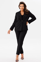 Брючный комплект из костюмной ткани на подкладке. Двубортный жакет выполнен в стиле оверсайз. Воротник-с отложными лацканами пиджачного типа, рукава - двухшовные. По переду- прорезные карманы с клапанами. Жакет имеет два ряда пуговиц, застегивается на две основные пуговицы, одну потайную, остальные пуговицы несут декоративный характер. Брюки-клеш с началом расширения от колена. Брюки с двумя карманами округлой формы и поясом-обтачкой. Застегиваются на молнию по переду и одну пуговицу.