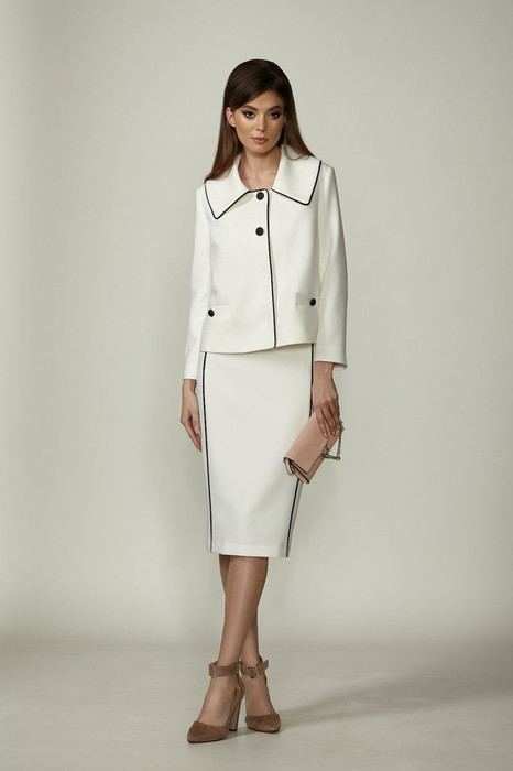 Комплект из костюмной ткани на подкладке, состоящий из жакета и юбки. Жакет прямого силуэта с нагрудными вытачками и прорезными карманами с листочками по переду. Воротник - широкий с отрезной стойкой, рукава – двухшовные, длиной 7/8. Застегивается на 2 пуговицы и пришивные кнопки. Юбка на подкладке, слегка зауженная к низу, с рельефами и поясом. В среднем шве заднего полотнища юбки - застежка-молния и шлица. Кант по краю борта, воротнику и рельефам юбки добавляет стиля и элегантности.
