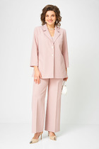 Брючный комплект из костюмной ткани на подкладке. Двубортный жакет полуприталенного силуэта с отрезными бочками и вытачками по переду и спинке. Воротник-с отложными лацканами пиджачного типа. По переду - прорезные  карманы  с клапанами. Рукава длинные, двухшовные. Жакет застегивается на две пуговицы. Брюки-клеш, плотно сидящие по фигуре, с  началом расширения 5см выше колена. Брюки с карманами по переду и обтачкой-поясом. Застегиваются по переду на молнию и пуговицу.