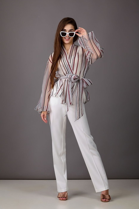 Брючный комплект ,состоящий из блузы и брюк. Прозрачная блуза из вуали  немного расширена к низу, с планкой по горловине и бортам.  Рукава-балон. Завязывается на пояс (идет в комплекте). Брюки прямого силуэта с наклонными карманами и поясом. Величина пояса регулируется резинкой. Застегиваются на молнию  пуговицу по переду.