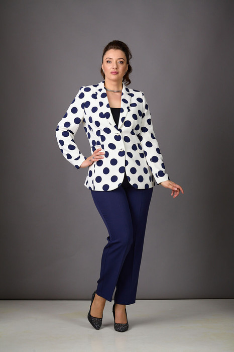 Эффектность и современный шик - горохи снова в тренде! Комплект из стрейчевой костюмной ткани на подкладке, состоящий из жакета и брюк. Жакет приталенного силуэта с карманами с клапанами по переду. Воротник с лацканами пиджачного типа, рукава - втачные, длинные. Застежка на пуговицы. Брюки со средней посадкой, зауженные к низу, с карманами и регулируемым резинкой поясом. Застегиваются на молнию и пуговицу.