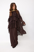 Комплект из плательной ткани, состоящий из блузы и брюк. Блуза асимметрична по длине, с V-образным вырезом горловины и завязкой-галстуком . Рукава – втачные, короткие, выполнены из гипюра. Брюки прямые со складкой, широким поясом-обтачкой, наклонными карманами. Застегиваются на молнию по переду и пуговицу. Комплект можно разнообразить поясами разного цвета. Пояс в комплект не входит.
