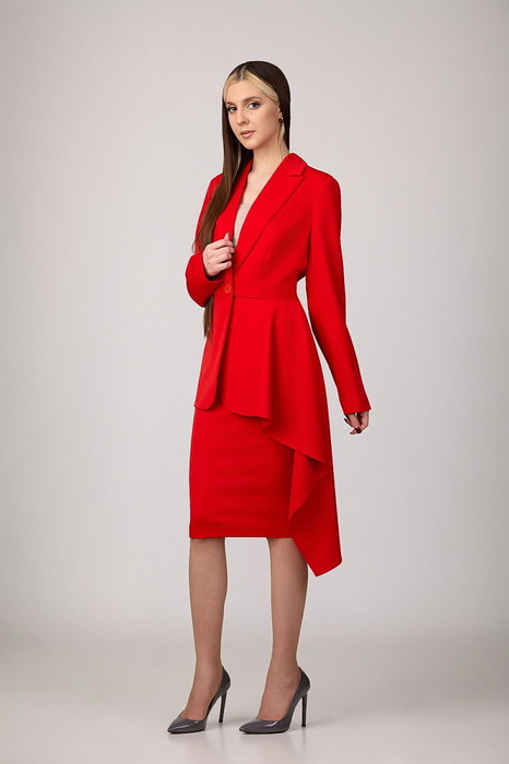 Жакет приталенного силуэта с рельефами по переду и спинке, отрезной по линии талии, с роскошной асимметричной баской. Воротник с отложными лацканами пиджачного типа. Рукава - втачные, двухшовные. Жакет застегивается на одну пуговицу.