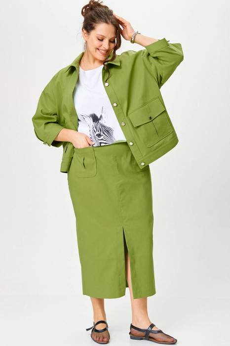 Юбка прямая, слегка заужена к низу, по переду разрез. Пояс частично на резинке.