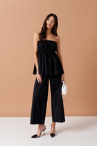 Брюки  на притачном поясе со шлевками. На передних половинках брюк расположены рельефы с маленькими разрезами по низу.  По спинке в пояс вставлена резинка. Застежка на молнию и пуговицу.