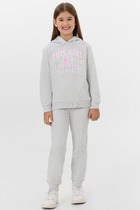 Комплект для девочки из футера, состоящий из 2 изделий: свитшот (джемпер) и леггинсы. Свитшот укороченный прямого силуэта, с длинными рукавами-реглан на манжетах. Круглая горловина оформлена бейкой. На переде принт. Низ свитшота не обработан.