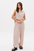 По передним половинкам боковые карманы с фигурным входом. По задним половинкам талиевые вытачки. Верх брюк обработан притачным поясом со шлёвками и с эластичной тесьмой-резинкой по спинке. Застёжка по переду на тесьму-молнию и петлю, пуговицу на поясе.