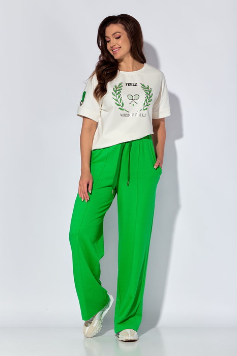 Комплект женский, 2х предметный, состоящий из свободной футболки и брюк. Футболка прямого силуэта с коротким рукавом. Рукав со спущенной линией плеча, по низу с манжетой, по центру задекорирован отделочной тесьмой с полукольцом. Горловина круглой формы с подрезной бейкой. Перед задекорирован принтом. По низу отрезная планка. По спинке кокетка и настрочная деталь с открытым срезом, задекорированная принтом. Брюки-палаццо. По переду застрочены защипы "стрелки". Карманы в боковых швах. Пояс цельнокроеный с резинкой по кругу. По переду петли и отделочная тесьма.