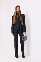 Брюки зауженные к низу, на манжете. Спереди карманы и смещенные рельефы с кантом. Пояс тритачной с резинкой сзади и по бокам.