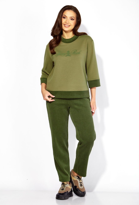 Комплект женский, 2х предметный, состоящий из джемпера и брюк, в сочетании двух видов трикотажного полотна. Джемпер прямого силуэта, с рукавом длинной 3/4. Рукав со спущенной линией плеча. По низу отрезная манжета. Горловина круглой формы, с широкой подрезной бейкой. По низу переда отрезная планка. Перед задекорирован принтом. Манжеты рукавов, бейка горловины и планка низа из отделочного трикотажного полотна. Спинка без особенностей. Брюки прямые. По переду наклонные карманы. Пояс притачной с резинкой и кулисой.