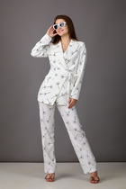 Отделкой служат молния, декоративная нашивка, наконечники. Фурнитура может незначительно отличаться от представленной на фото. Длина жакета от центра горловины спинки до низа 72,5-73,5 см. Длина рукава 61 см. Длина брюк по боковому шву без учета пояса 99 см. Материал хорошо тянется.