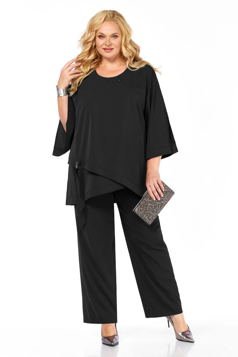 Нарядный женский комплект-двойка, состоящий из туники и брюк, выполнен из струящейся ткани. Ассиметричный крой в сочетании со стильной фурнитурой создаёт яркий притягательный образ для праздничных событий.