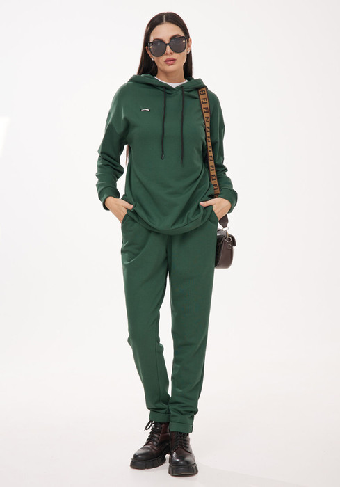 Костюм двойка включает в себя брюки с цельнокроенной манжетой и удлиненного худи с капюшоном.