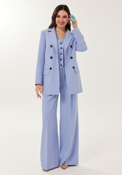 Костюм женский 3-х предметный, состоящий из жакета, брюк и жилета. Костюм выполнен из поливискозы. Жакет полуприлегающего силуэта, на подкладке, с двухбортной застежкой на петли и пуговицы. Горловина жакета оформлена воротником пиджачного типа. Рукава двухшовные длинные с возможностью подворота длины. Перед с нагрудными выточками, выходящими из рельефов. В области бедер обработаны прорезные карманы "в рамку" с клапаном. Спинка со средним швом и рельефами. Жилет полуприлегающего силуэта, на подкладке, с центральной застёжкой на петли и пуговицы. Горловина V-образной формы. По переду талиевые вытачки, в области бедер настрочены декоративные листочки. Спинка  со средним швом и талиевыми вытачками. Низ переда жилета фигурный. Брюки формы "палаццо",  со стрелками по передним и задним половинкам. Верхний срез обработан притачным поясом., с резинкой в области спинки. По центру переда - застёжка на крючок и тесьму-молнию. На задних половинках расположены талиевые вытачки. В боковых швах расположены наклонные карманы.