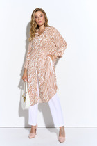 Комплект женский 2-х предметный, состоящий из рубашки и брюк. Рубашка выполнена из поливискозы с принтом "елочка". Рубашка длиной до середины бедра, прямого силуэта, с центральной застёжкой на петли и пуговицы. Горловина рубашечного типа. Блуза со спущенной линией плеч. Рукава длинные, по низу обработана шлица и притачные манжеты, которые застёгиваются на 2 петли и пуговицы. На одной манжете настрочена декоративная нашивка. В области груди, с одной стороны, накладной карман с декоративной нашивкой. Спинка с кокеткой и со средним швом, в котором обработана шлица, застегивающаяся на 3 петли и пуговицы. Низ рубашки закруглен. Брюки  выполнены из поливискозы однотонного компаньона. Брюки прямого силуэта, слегка заужены к низу. Низ брюк с цельнокроеной манжетой. Брюки с отстроченными по переду стрелками и заутюженными по задним половинкам. Верхний срез обработан притачным поясом, в который вставлена резинка. По центру переда - застёжка-обманка. В боковых швах расположены наклонные карманы.