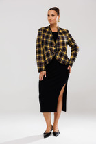 Костюм состоит из жакета и брюк. Качественная поливискоза, из которой выполнена модель, обеспечит долговечность изделию и приятные ощущения его обладательнице. Жакет без подкладки прямого силуэта, с двубортной застежкой на петли-пуговицы, длиной до середины бедра. Перед жакета с нагрудными вытачками, в области груди расположена декоративная листочка. Спинка с двойной кокеткой, в шве притачивания которой обработана встречная складка. Низ жакета фигурный, с закруглениями по боковым швам. Рукава двушовные, длиной  3/4, по низу с манжетой, застегивающейся на петлю и пуговицу. Горловина оформлена воротником пиджачного типа.  Брюки классической формы, прямые от линии бедер, со стрелками по передним и задним половинкам. Верхний срез обработан поясом, в который от бокового шва вставлена резинка по задним половинкам. В боковых швах обработаны наклонные карманы. На задних половинках расположены талиевые вытачки. В комплект входит пояс из основной ткани.