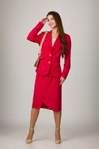 Костюм женский из комбинированных видов ткани, состоит из жакета и юбки. Костюм предназначен для повседневной носки. Жакет женский прямого силуэта из ткани типа шанель с застежкой планкой до верха на 5 петель и пуговиц (размер и цвет фурнитуры может незначительно отличаться от фото), на притачной подкладке. Перед жакета с нагрудными вытачками. На передних половинках жакета, расположены накладные карманы с планкой из отделочной ткани, которые застегиваются на петли пуговицы, верхней части переда и нижней части переда. Спинка со средним швом. Рукава втачные, двухшовные, длинные. Низ рукавов с притачными манжетами из отделочной ткани. Горловина круглой формы, обработана отложным воротником с острыми углами из отделочной ткани. Плечевой пояс с плечевыми накладками. Юбка женская длиной за колено из отделочной ткани, на отлетной подкладке. Перед с двумя бантовыми складками. В боковых швах с переди обработаны карманы с наклонной линией входа. Спинка со средним швом и талиевыми вытачками. В верхней части среднего шва обработана застежка на потайную тесьму-молнию. Верхний край юбки обработан притачным поясом, застегивающимся на одну петлю пуговицу.