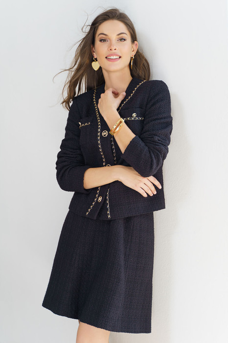Элегантный твидовый костюм с юбкой — это воплощение классического стиля и утонченности. Жакет с изысканной отделкой золотой цепочкой и пуговицами добавляет нотку роскоши и подчеркивает изящность силуэта. Юбка расширенная к низу обеспечивает комфорт и идеальную посадку, создавая гармоничный и женственный образ. Этот комплект идеально подойдет для деловых встреч, стильных мероприятий или прогулок, где требуется выглядеть элегантно и уверенно. Сочетайте с минималистичными украшениями и обувью на каблуке, чтобы завершить безупречный образ.