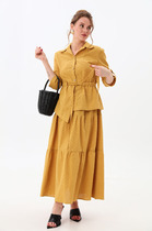 Левая часть горловины оформлена цельнокроеным воротником - стойкой, правая воротником-шаль, переходящим в стойку на спинке. Обтяжные пуговицы, правый воротник – шаль, деталь верхнего левого кармана выполнены из отделочной молочной ткани. Жакет с плечевыми накладками.