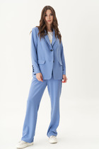 Жакет оформлен настрочной отделочной тесьмой-бахромой  из основной ткани, идущей по горловине, вдоль борта, карманам, низу переда и рукава.