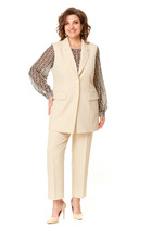 Брюки женские прямые от бедра, в размерах 46,48 на обтачном поясе, в размерах 50,52,54,56 с притачным поясом, с резинками на уровне боковых швов. По поясам с 5-ю шлевками, с застежкой на тесьму - «молнию», расположенную в среднем шве передних половинок. Пояс застегивается спереди на 1 пришивной потайной крючок, 1 петлю и потайную пуговицу (размер и цвет фурнитуры может незначительно отличаться от фото). Передние половинки брюк с боковыми наклонными карманами. Задние половинки брюк с талиевыми вытачками, идущих от пояса вниз. Брюки с заутюженными стрелками по передним и задним половинкам.