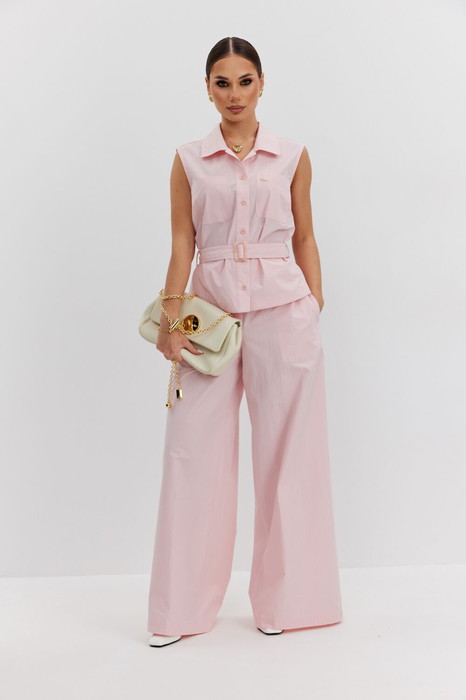 Блузка женская полуприлегающего силуэта, из хлопковой ткани с «креш»-эффектом. Спинка со средним швом. Застежка на планку и 6 петель и пуговиц, по переду накладные карманы, низ блузки на обтачке. Воротник рубашечный отложной. В комплекте пояс из основной ткани с декоративной пряжкой. Длина 55 см.