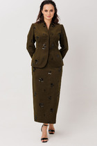 Костюм женский двухпредметный, состоящий из жакета и брюк. Жакет полуприлегающего силуэта с центральной бортовой застёжкой на одну петлю-пуговицу до линии перегиба лацкана. Перед с талиевой вытачкой и прорезным карманом с листочкой с втачными концами. Спинка со средним швом. Рукав втачной двухшовный длинный. Воротник пиджачного типа. Брюки классического кроя, слегка зауженные к низу с притачным поясом с резинкой по задним половинкам брюк. Брюки с наклонным к боковому шву карманом и двумя фигурными хлестиками на одну пуговицу по поясу передних половинок. Застёжка на тесьму - молнию и одну петлю-пуговицу по поясу. Низ брюк имеет фигурную форму - укорочена по передним половинкам и удлинённые по задним. Длина жакета по спинке - 59 см. Длина рукава - 61 см. Длина брюк по боковому шву - 96 см.