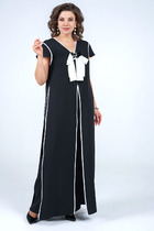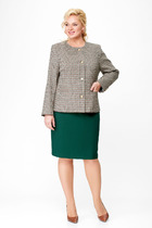 Костюм женский двухпредметный, состоящий из жакета и юбки. Жакет полуприлегающего силуэта с центральной бортовой застежкой на 5 петель-пуговиц. По переду обработаны нагрудные вытачки и по 3 защипа-складки по талии. Спинка со средним швом и двумя защипами-складками с двух сторон. Горловина V-образной формы, с цельнокроенной стойкой и с отрезным швом по спинке. Рукав втачной двухшовный длинный. Юбка заужена к низу, длиной за колено. Переднее полотнище с талиевыми вытачками. Заднее полотнище со средним швом, заканчивающимся шлицей, и с застежкой на потайную тесьму-молнию. Заднее полотнище также с талиевыми вытачками по 2 шт.