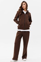 Костюм женский двухпредметный, состоящий из жакета и брюк. Жакет полуприлегающего силуэта на подкладке с центральной бортовой застежкой на 2 декоративные петли-пуговицы. Перед с талиевой вытачкой, отрезным бочком и карманом с листочкой. Борт имеет закругленную форму. Горловина оформлена фигурно с цельнокроенной стойкой по переду и с отрезной по спинке. Спинка со средним швом. Рукава втачные двухшовные с отлетной шлицей, открытой с настрочной декоративной тесьмой, двумя блочками и одной петлей-пуговицей. Брюки классического кроя, слегка зауженные к низу, с притачным поясом сзади на резинке. Застежка на тесьму-молнию и одну петлю-пуговицу по поясу. Карман фигурной формы, с отрезным бочком. На изделии заутюжены стрелки.
