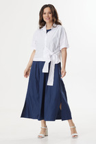 Костюм женский двухпредметный, состоящий из блузы и юбки. Блуза прямого силуэта, декорированная вышивкой, с нагрудными вытачками, выходящими из боковых швов, и с разрезами. Спинка со средним швом, в котором обработан разрез с навесной петлей и пуговицей. Горловина овальной формы. Рукава короткие фантазийной формы на запах со складками по окату. Рукав двойной, обтачен атласной тканью. Юбка-карандаш длиной до линии колена, с притачным поясом из атласа, на резинке между талиевыми вытачками. Заднее полотнище со средним швом, заканчивающимся шлицей. Застежка на одну петлю-пуговицу по поясу и тесьму-молнию в среднем шве.