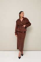 Жакет прямого свободного покроя со спущенной линией плеча. По переду обработана планка. Застежка центральная бортовая на золотые кнопки. По спинке и переду обработана кулиса со втянутой шляпной резинкой и золотыми фиксаторами. Воротник отложной. Рукав длинный с защипами по низу и патой. Низ рукава обработан притачной манжетой с застежкой на золотую кнопку. По переду имеются накладные карманы авторской формы и клапанами.