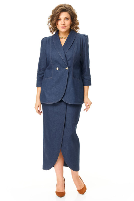 Комплект женский состоит из жакета и юбки. Жакет полуприлегающего покроя с зауженной линией плеча. Застежка двубортная на золотые пуговицы. По спинке и переду обработаны рельефы выходящие из плеча. Низ борта округлой формы. Воротник типа "шаль". По переду обработаны карманы в подрезах. Рукав длиной 3/4 со складками по окату.
