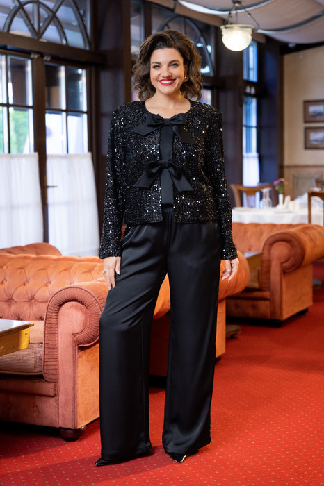 Комплект женский состоит из жакета, топа и брюк.