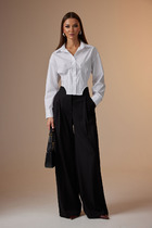 Блуза свободного покроя со спущенной линией плеча. Центральная бортовая застёжка с планкой на петли-пуговицы Рукав втачной одношовный. Низ рукава с манжетой из полотна с пайетками и складками. Спинка с кокеткой и встречной складкой. Воротник на отрезной стойке блузочного типа. По переду настрочены декоративные клапаны из полотна с пайетками.