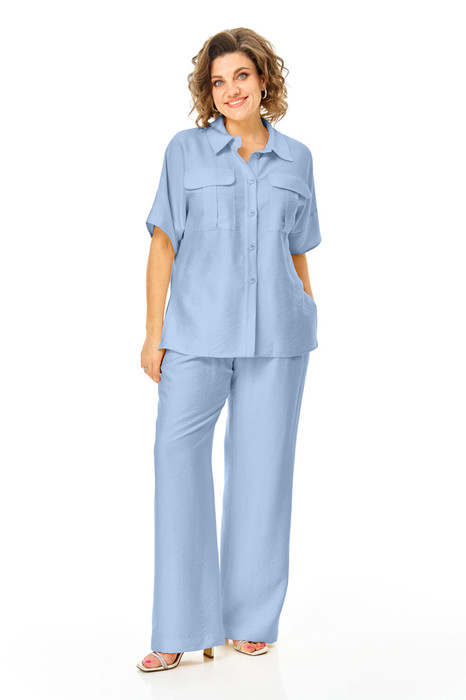 Блуза прямого свободного покроя со спущенной линией плеча. По переду обработана планка.Застежка центральная бортовая на петли-пуговицы.Воротник блузочный отложной. Рукав  короткий до линии локтя. По переду имеются накладные карманы с бантовыми складками и клапанами. В боковых швах обработаны разрезы.