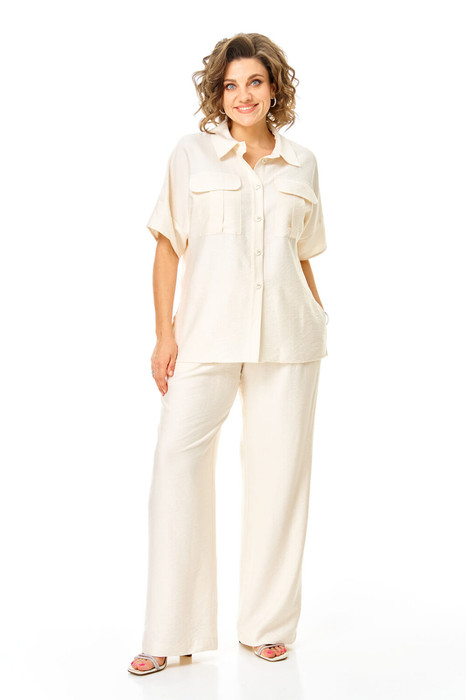 Блуза прямого свободного покроя со спущенной линией плеча. По переду обработана планка.Застежка центральная бортовая на петли-пуговицы.Воротник блузочный отложной. Рукав  короткий до линии локтя. По переду имеются накладные карманы с бантовыми складками и клапанами. В боковых швах обработаны разрезы.
